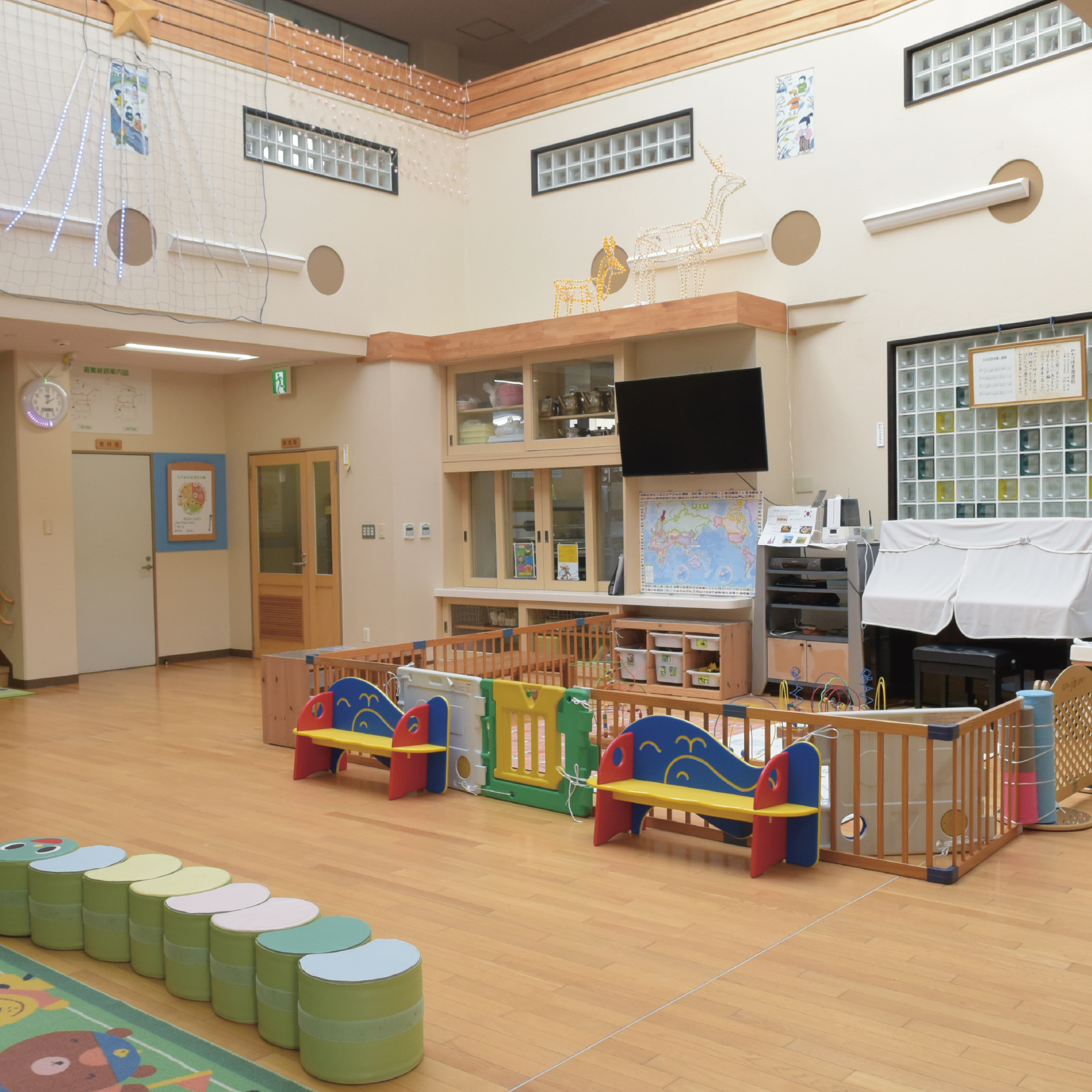 天上の大きな窓からやさしい光が差し込む、明るくあたたかなホールです。おままごとや人形、木製玩具で楽しく遊びながら、想像力や表現力、友だちとの関わりを育みます。