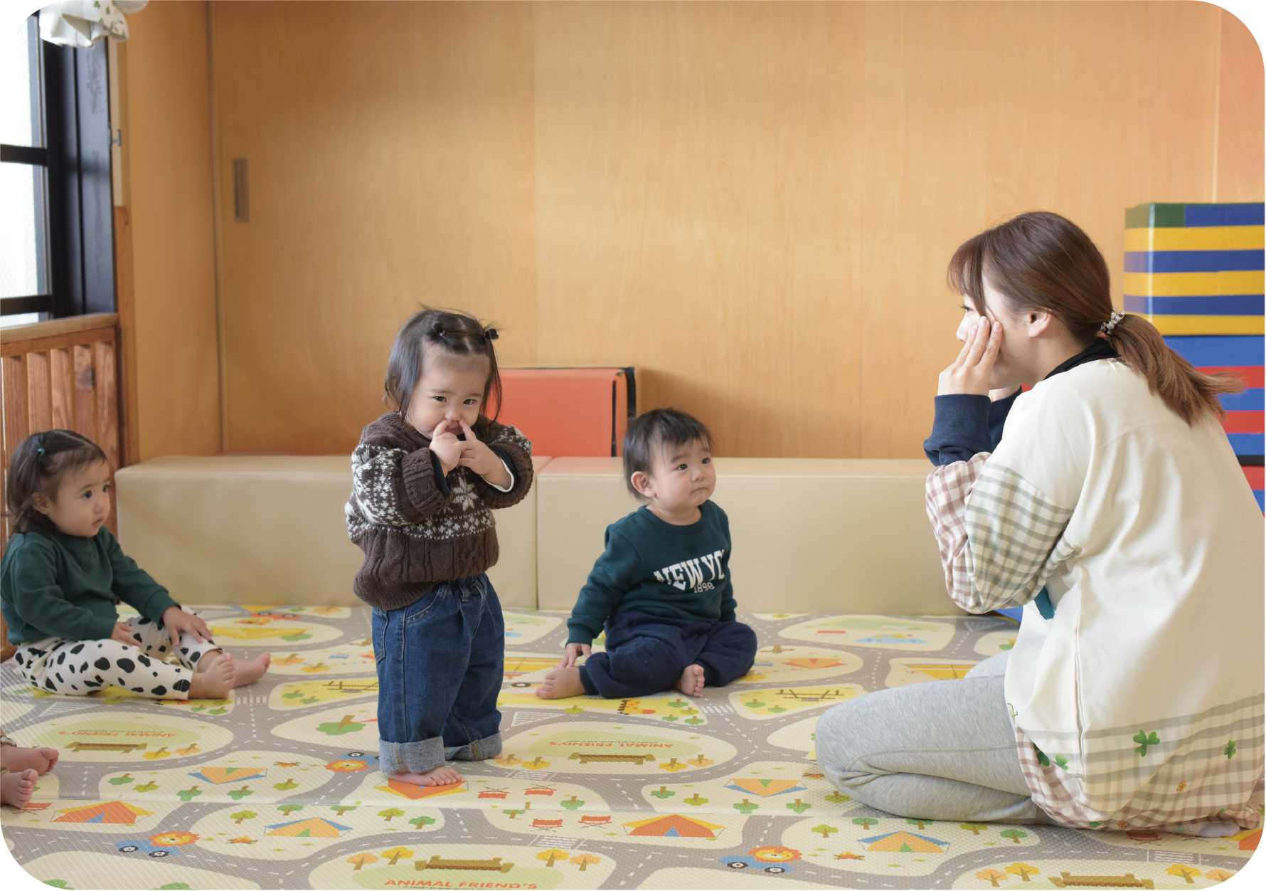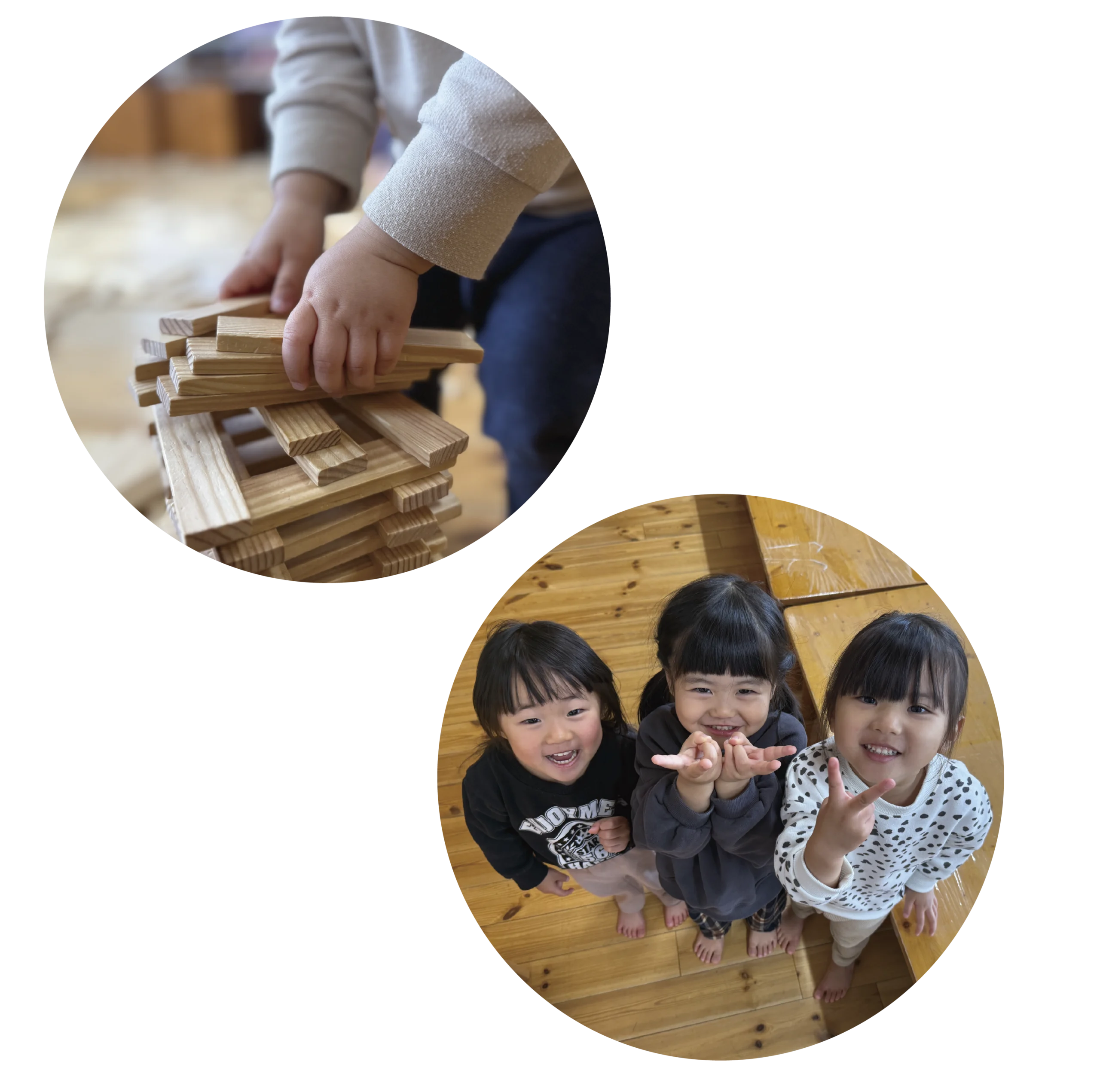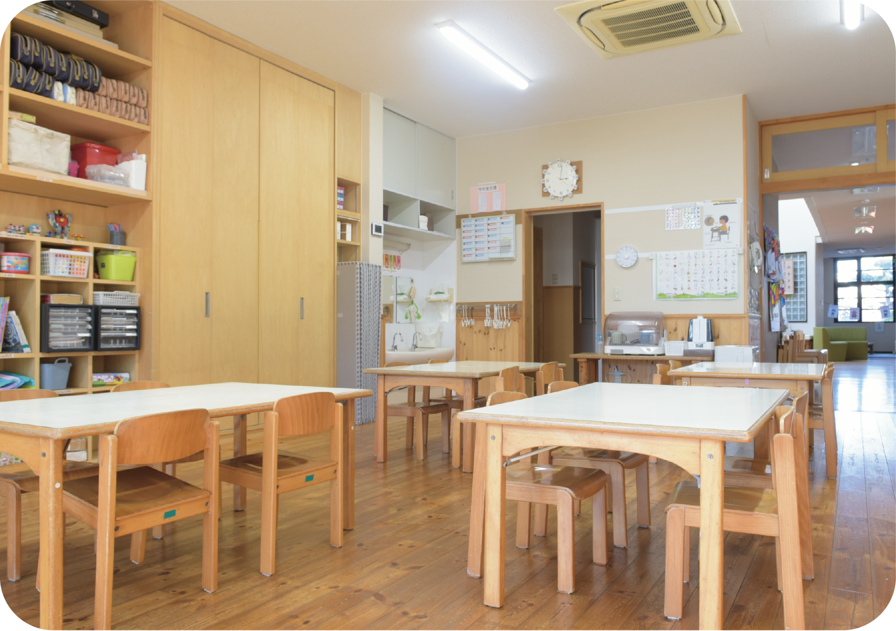 大きな窓からやさしい光が差し込む、明るく開放的な保育室です。木のぬくもりを感じられる空間の中で、子ども一人ひとりの成長や興味に寄り添いながら、「自分で選び、取り組む」主体的な体験を大切にしています。