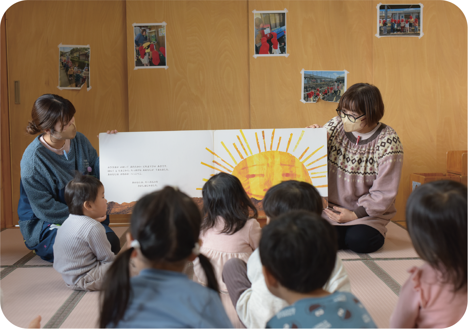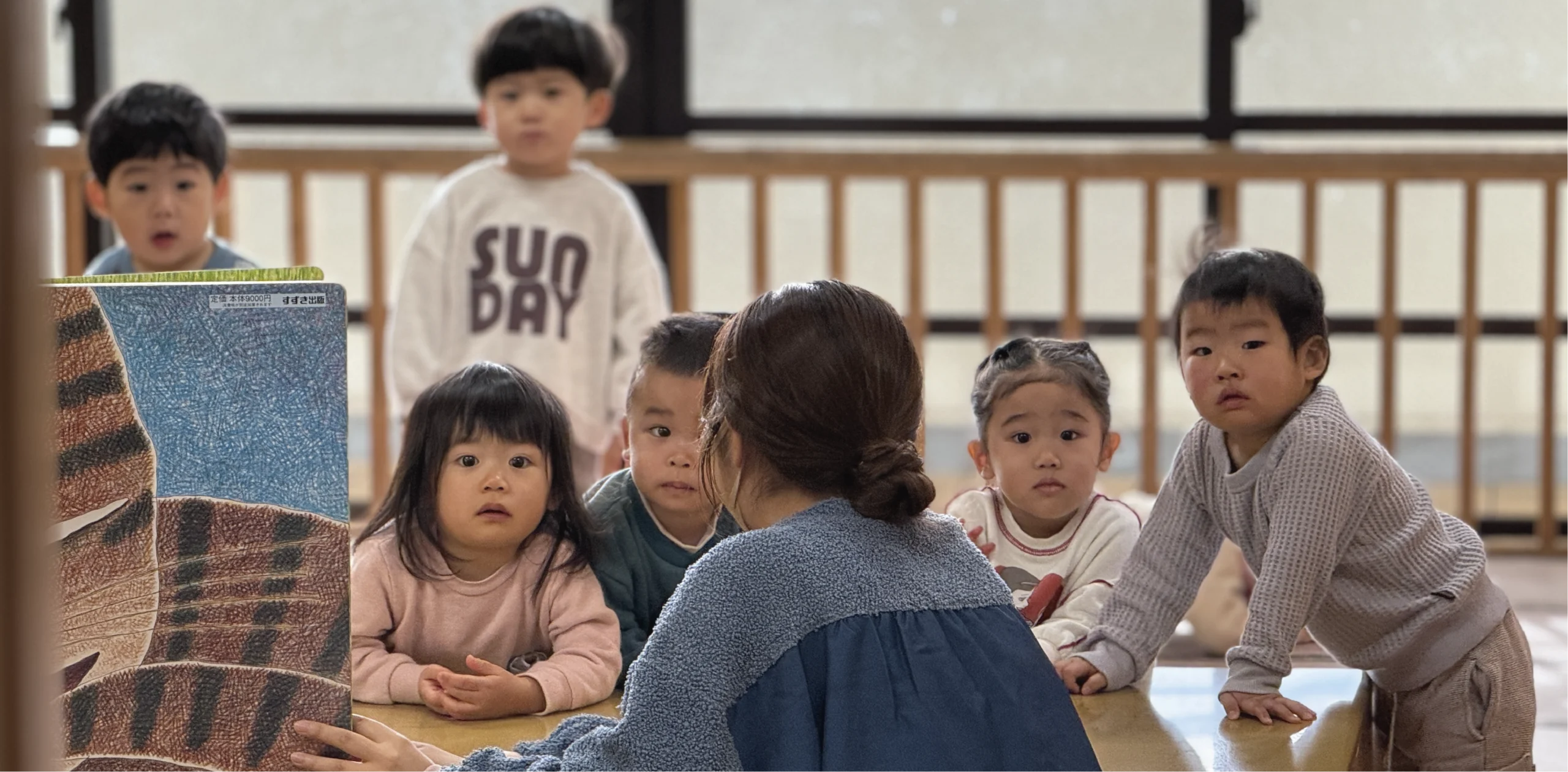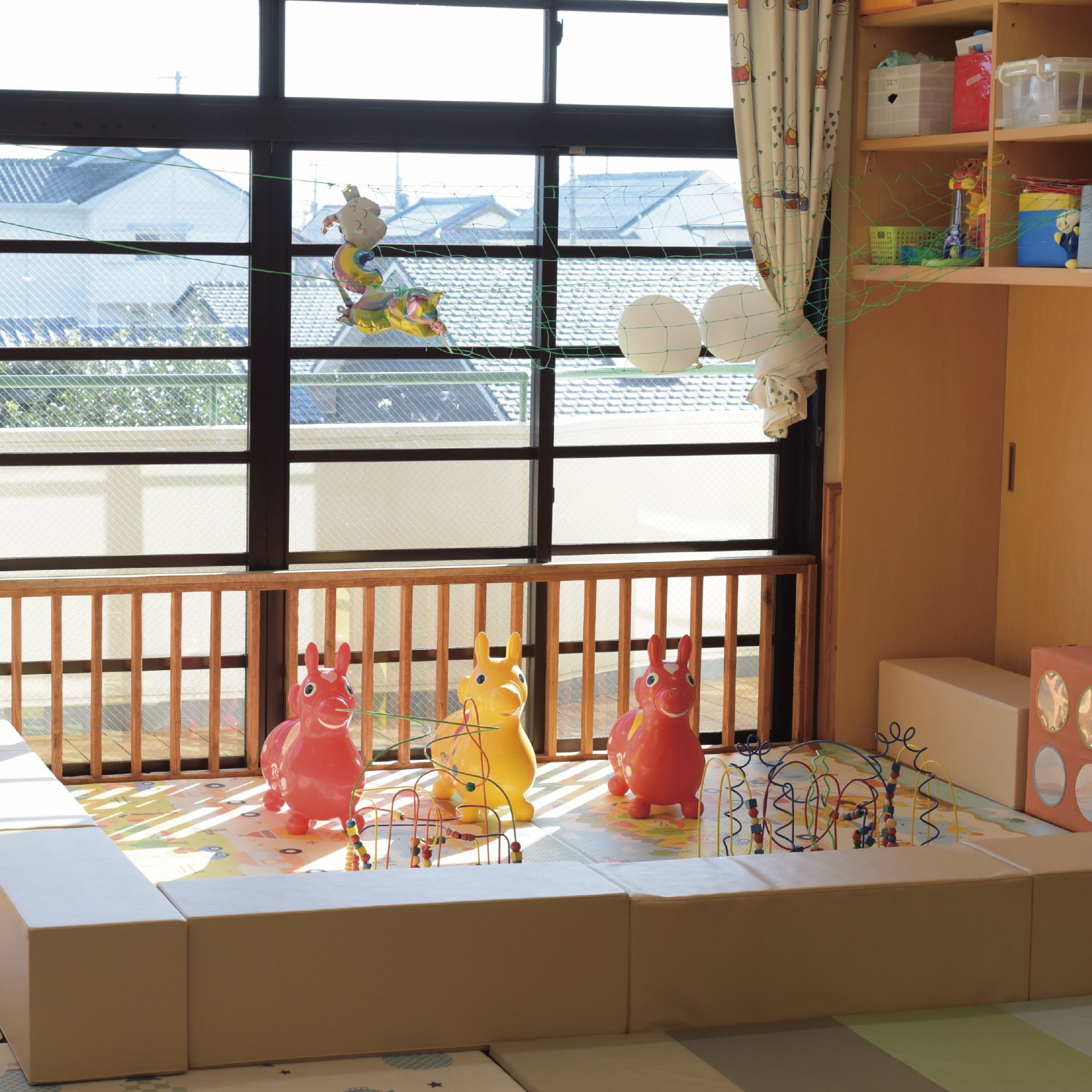 大きな窓からやさしい光が差し込む、明るく開放的な保育室です。木のぬくもりを感じられる空間の中で、子ども一人ひとりの成長や興味に寄り添いながら、「自分で選び、取り組む」主体的な体験を大切にしています。