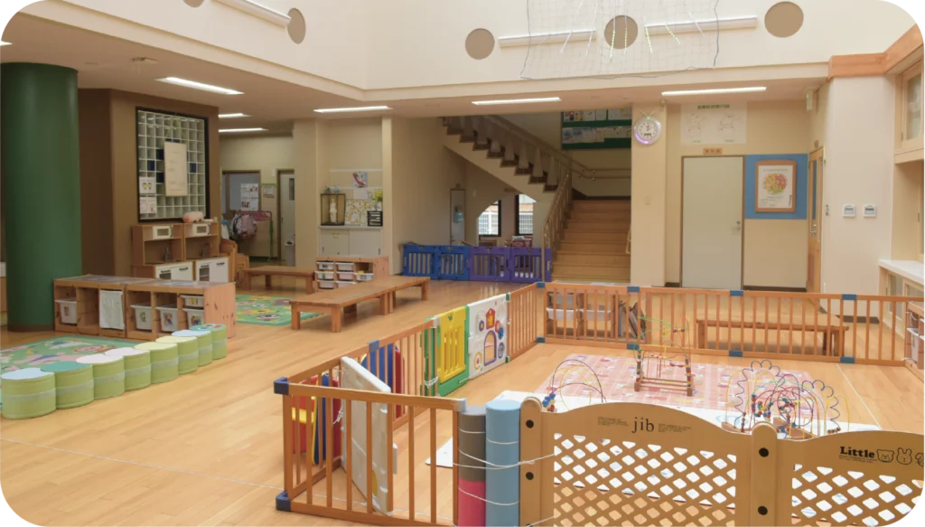 わかば保育園の園舎は、子どもたちが毎日安心して過ごせる環境づくりを大切にしています。年齢や成長に合わせた空間設計と、のびのび遊べる広さを確保し、主体性や思いやりの心を育みます。遊びも生活もすべてが学びにつながるよう、保育の視点で整えられた園舎です。