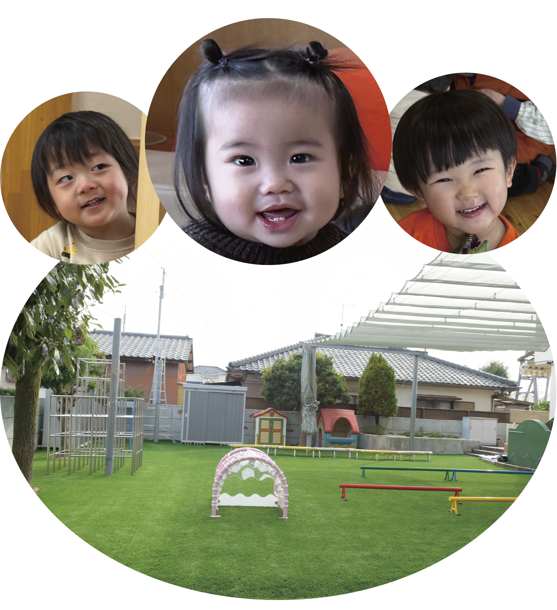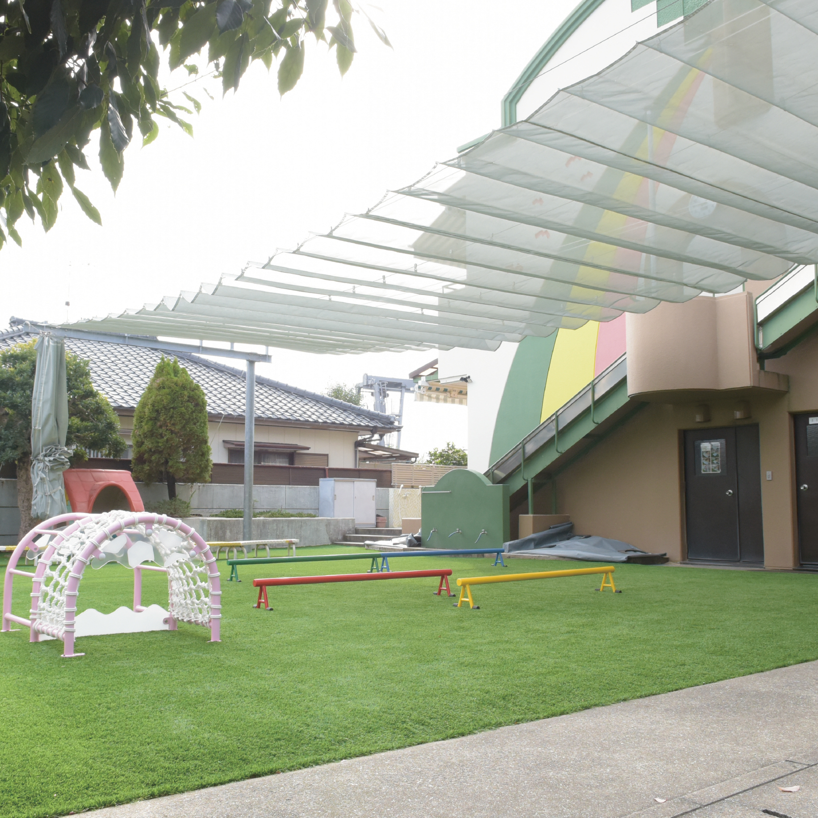 わかば保育園の園庭は、子どもたちが思いきり体を動かし、季節を感じながら遊べる大切な場所です。自慢の人工芝が広がる園庭では、安心して走ったり寝転んだりすることができます。広々とした空間で四季の変化を感じながら遊ぶ中で、健やかな体と豊かな感性を育みます。