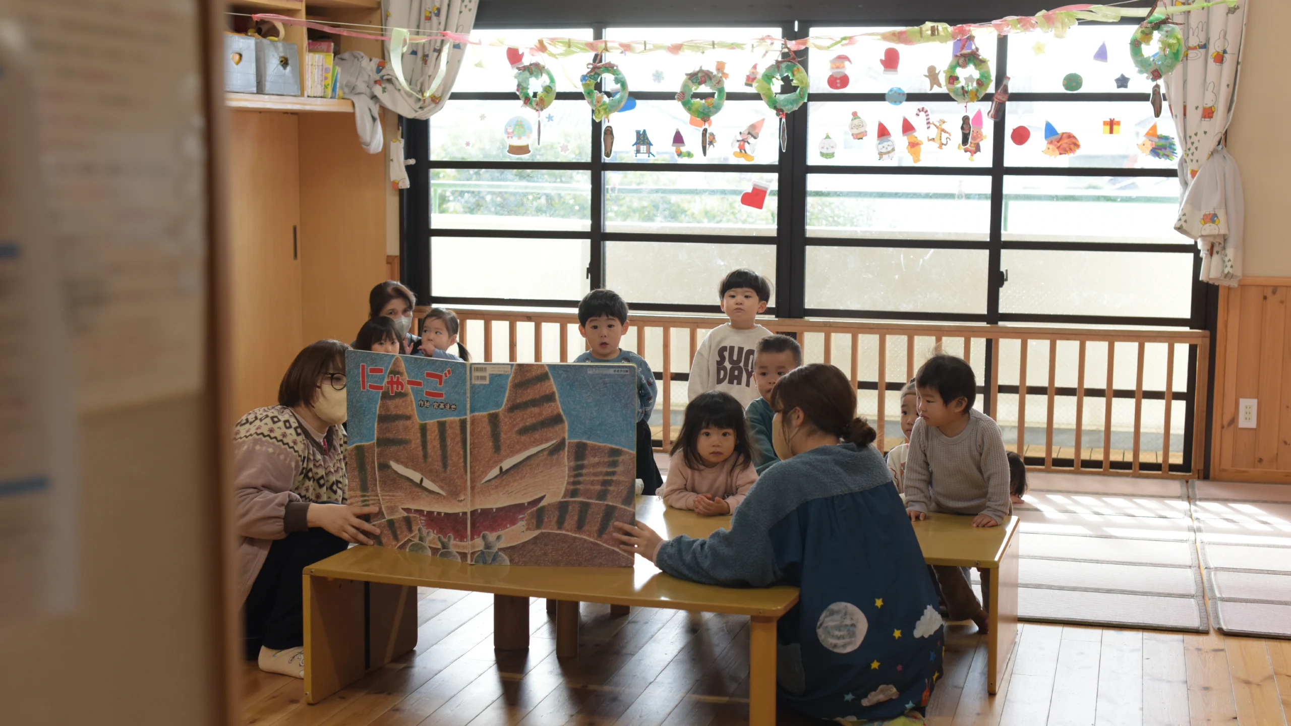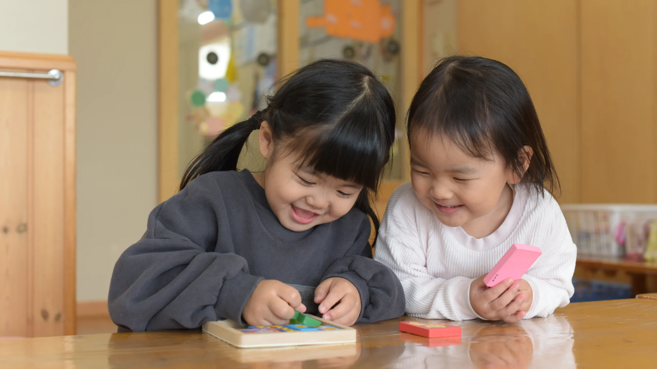 大きな窓からやさしい光が差し込む、明るく開放的な保育室です。木のぬくもりを感じられる空間の中で、子ども一人ひとりの成長や興味に寄り添いながら、「自分で選び、取り組む」主体的な体験を大切にしています。